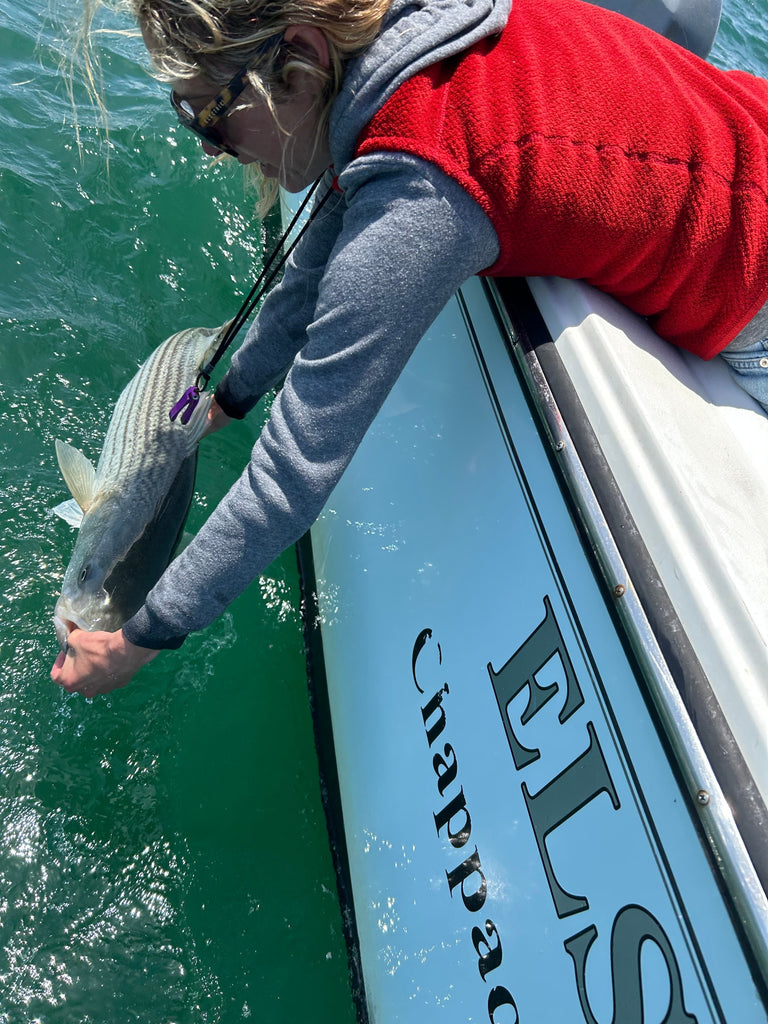 During our guided fly fishing charters this week, we've focused on fishing the rips off Martha's Vineyard, and it's proven to be a massive success! Striped bass are thick, healthy, and hangry! Head Kismet Outfitters guide Abbie Schuster has fished Martha's Vineyard her entire life and can't recall a time when she saw the rips this thick with over-slot stripers.