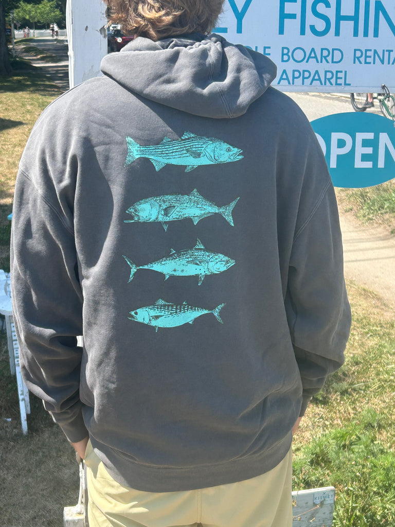 Kismet Outfitters' Garment Dyed and Bomb Proof Hooded Sweatshirt featuring Martha Vineyard's iconic gamefish.